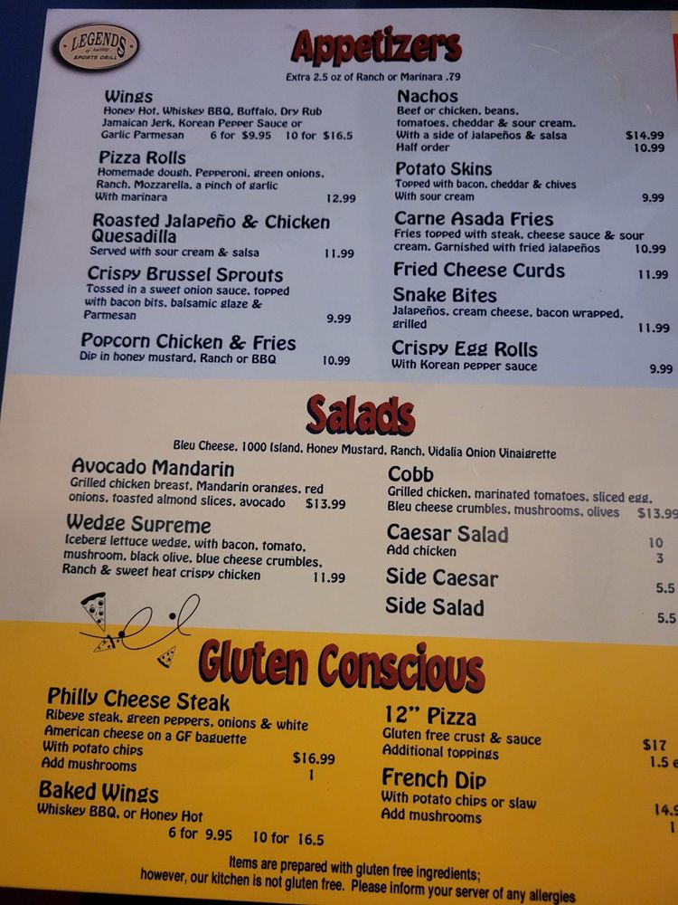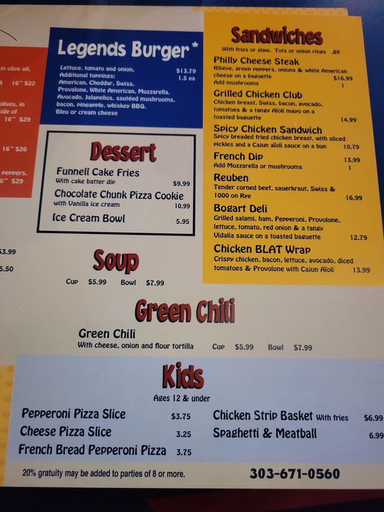 Legends of Aurora Sports Grill is a popular sports bar offering a diverse menu of pizzas, sandwiches, and appetizers. Located in Aurora, Colorado, this casual spot is perfect for lunch, dinner, or late-night bites. Known for their wings, pizza rolls, cheese curds, and unique dishes like snake bites and potato skins, the menu caters to a variety of tastes. Customer reviews highlight the friendly staff, excellent service, and gluten-free options for those with dietary restrictions. With a cozy atmosphere, ample seating, TVs for sports viewing, and special amenities like outdoor seating, wheelchair accessibility, and free Wi-Fi, Legends of Aurora Sports Grill is a go-to spot for gatherings with friends and family. The affordable prices and daily specials make it a budget-friendly choice for a night out. Make sure to try their signature Philly cheesesteak and build-your-own burger for a satisfying meal experience.